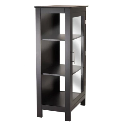 The Poppy Display Curio Cabinet is perfect for use all over the home for storage and display with modern style. Modern style is very sleek with clean angular lines. The efficient storage cabinet features tempered glass on all three sides with solid back which is great for viewing. Display and store your collectibles, dishes and treasures with easy viewing of contents. Cabinet comes with 3 Shelves. Only Top shelf is adjustable. Each shelf area is 19.69″W x 14.06″D. Lower Shelf height clearance is 12.83″. Satin Finish Metal handle for added style and easy to open door. Overall assembled cabinet size is 23.63″W x 15.75’D x 47.24″H. Construction with combination of solid and composite wood in Black finish. Tempered Glass Door and Glass side panels with wood trim. Assembly Required.