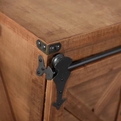 Compliment your entertaining space with the Presley 55 Inches TV stand from the Signature Collection from StyleCraft Home Collection. The entertainment console stand has a rustic look with a natural brown finish and black hardware. It features two barn-style rolling doors on either side of a large center section that features two side-by-side drawers underneath an open shelf. This gorgeous TV stand combines style and function with a unique look and plenty of cabinet space to store all your media. Pairs well with farmhouse or rustic styling. Due to lighting and monitor differences, actual colors and finishes may vary slightly from what appears online.