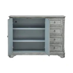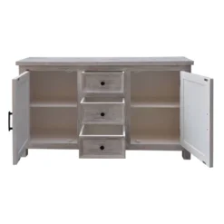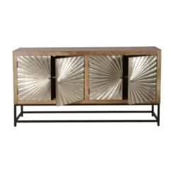 This rectangular credenza adds a mid-century modern feel to your kitchen, dining room, or foyer with its sleek design and metal capped feet. It is crafted with Ash veneer in our Crafter Brown finish, and it features a waffle design inlay on each door for a breezy look. This generously proportioned piece features four cabinets with two shelves for storing dining linen, cookbooks, and more.