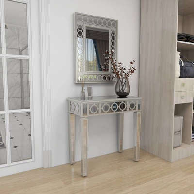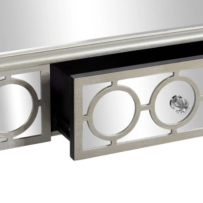 - •Silver vanity table and mirror set features circular cut out overlay the mirror paneling structure with one drawer for additional storage space
