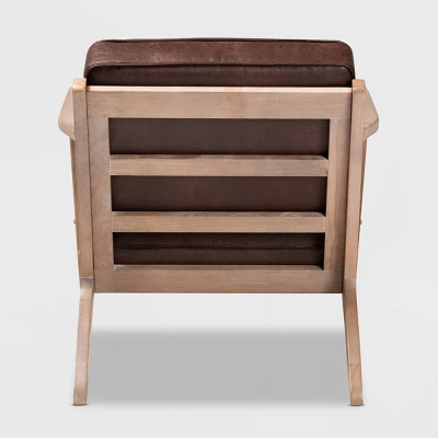 Create a cozy, retro reading alcove in your living space with the Sigrid armchair. Featuring a low profile and wide, angular frame, the Sigrid displays all the hallmarks of mid-century design. The seat and back are upholstered in a sleek dark brown faux leather effect fabric that complements the antique oak finish on the solid rubberwood frame. Its thick, foam-padded cushions provide comfort for years to come. Striking from any angle, the Sigrid is well suited for both private residences and public office spaces. The Sigrid armchair is made in Malaysia and requires assembly. Dimensions: 29.13″ high x 29.33″ wide x 36.02″ deep; Seating dimensions: 22.83″ wide x 21.65″ deep x 16.34″ high (from Floor); Arm height: 21.06″ high; Back: 15.35″ high; Legs: 10.63″ high;