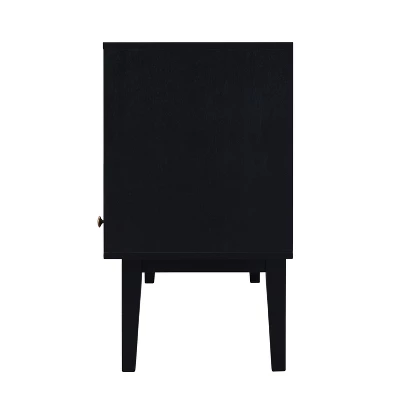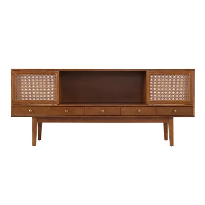 Yes you cane. Slide into midcentury modern pizzazz with the Holly & Martin Simms Media Console. Wide scale open storage stacks up electronic accessories, board games, and your vintage record player. Cane doors glide back and forth for easy access to your entertaining fare, or screening of cable boxes and the like. Five small drawers tuck away decks of cards, remotes, or current reads. Storage and style – you do it all with this anywhere console rocking an eclectic retro look in the entry, dining room, or living space.