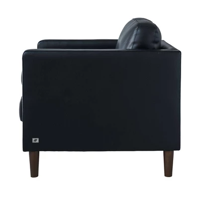 The Picket House Furnishings Sire Loveseat is a sleek addition for your office, living room, and more. Upholstered in rich leather with wooden tapered legs. Piped seams add a touch of Sophiscation. Constructed of solid wood and plywood. Includes two bolster pillows for décor. Perfect for small spaces, add the Picket House Furnishings Sire Loveseat to your home for a modern flair.