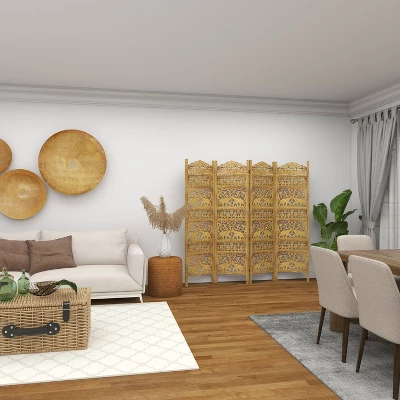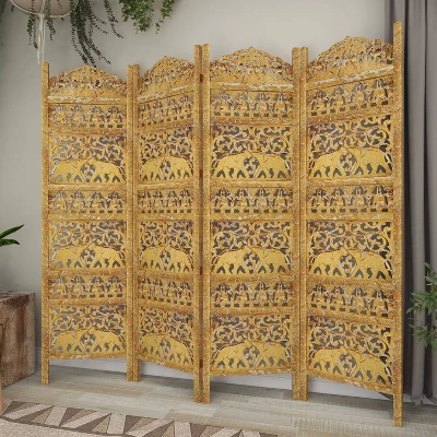 This 4-panel room divider is see-through because of the traditional carvings. Still, it can provide privacy with the addition of curtains or Japanese paper. Designed with felt or rubber stoppers at the base that prevent scratching furniture and table tops, as well as sliding around. This item ships in 1 carton. This item features foil detailing that is hand-applied by artisans with adhesive and thin layered flakes of metallic foil to achieve the distressed metallic effect. This high-end technique is intricately applied to each piece to add dimension and elevate the style. Due to the handmade nature of this item, no two will be alike, and there will be slight differences in color and foil pattern. Suitable for indoor use only. This item ships fully assembled in one piece. Made in India. Item features 4 panel screens. This is a single gold colored folding panel partition. Traditional style.