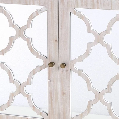 Improve the look and feel of your living room or bedroom space with the white Washed Two Door Storage Cabinet. This sturdy indoor cabinet has two doors with mirrored fronts, adding a unique element to any space. This cabinet has a continuous inner shelf and is finished in white washed wood. Due to lighting and monitor differences, actual colors and finishes may vary slightly from what appears online.