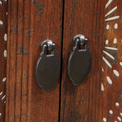 Style and storage all in one. Update the look of your home while adding the convenient storage you need with this storage cabinet from the Viabella collection. This lateral storage cabinet features a hidden storage area along with an adjustable shelf behind each of its three large doors. These adjustable shelves can be moved to different heights to create flexible storage for items of all shapes and sizes. Store a variety of different items like dinnerware and napkins to storage bins and board games. It has room for all your things! Each door front is detailed with a graphic tile pattern that adds an extra dimension of style that is sure to stand out in your home. This cherry storage cabinet also offers a spacious top surface to display home décor items like decorative plants, knick-knacks, and photos of your family and friends. Finished in Curado Cherry and detailed with attractive hardware, this beautiful home storage cabinet is everything you need and more.
