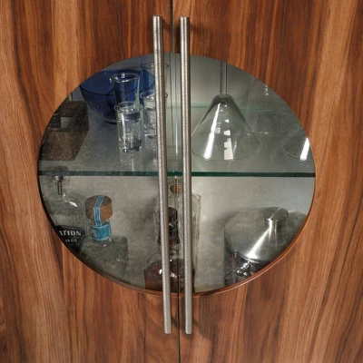 - Doors feature glass insert.Accented with metal pulls and base framing in brushed nickel finish.