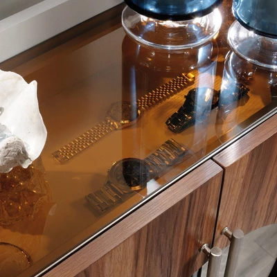 - Adjustable, safety-tempered glass shelf behind doors offers flexible storage options.