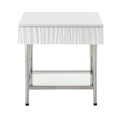 The soothing wavy texture and glossy white finish of this end table makes it the perfect addition to any room. There is plenty of space for a reading lamp and a few of your favorite novels plus a single drawer for added storage. Perfect in pairs, with one on either side of your sofa, but equally elegant alone to accentuate any space.
