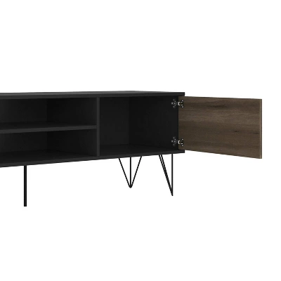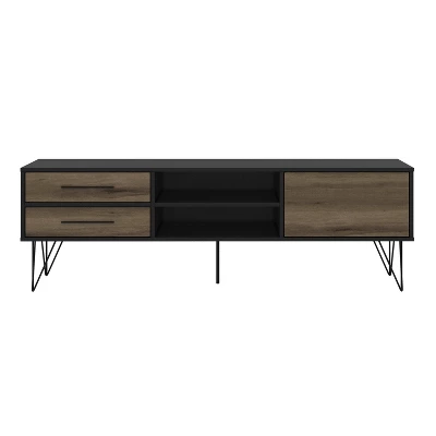 Provide a sophisticated abode to all your media gadgets by bringing in this contemporary style TV Media Console Stand which offers spacious storage with its 1 side door cabinet, 2 drawers, and 2 open compartments. Constructed from the combination of particleboard and metal, this entertainment center for your flat screen TVs is accented with a brown and black finish.