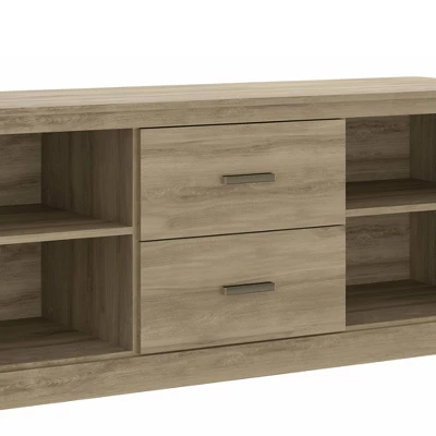 Designed with perfection, this clean lined TV Stand is sure to accentuate the aesthetics of your interior and at the same time will provide sophisticated abode to all your media gadgets. Incorporated with 2 smooth gliding drawers and 4 open compartments for your media necessities, the structure rests on a stable base. Constructed from the CARB certified wood product to ensure stable equilibrium with nature and health, the oak brown accent is an add on to its look. The bar pulls facilitate easy access to the storage space. Equipped with a stout appeal, which adds to the sturdiness of the TV Stand, the transitional style inspired TV Stand readily assimilates with a variety of decor settings.