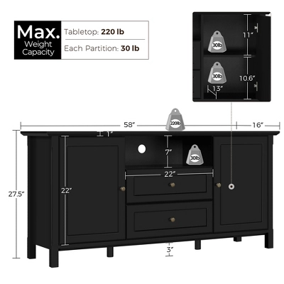 - 【Suitable for 220 lb/ 100 kg TVs up to 65″】The top of this classic media entertainment center, measuring 58″ L × 16″ W / 147 cm L × 40 cm W , suits TVs up to 65″. If your TV is a little bit larger than 65″ but below the 220 lb/ 100 kg, this TV console table is still your ideal pick