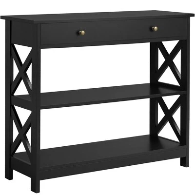 - Try this minimal one with a big drawer and 2-layer shelves. Boasting CARB P2 MDF board and pinewood legs covered by water-resistant veneer, this 3-tier console table is stable, safe and easy to maintain. It is designed into a 3-layer structure with 2 open shelves and 1 big drawer, allowing you to accommodate some frequently used items or decorations on it. This 3-tier console table features a minimal and chic style that can harmoniously fit various home or commercial decors. Best of all, it is a budget model that aims to have all your concerns covered.